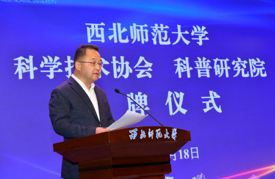 包俊宗在讲话中代表省科协向西北师大科协、科普研究院的成立表示热烈祝贺。他指出,西北师大拥有丰富的科技资源和较强的科研力量,在科技创新、学科建设、人才培养等方面均处于西北乃至全国重点高校前列。今天,学校同时挂牌成立科协和科普研究院,必将对我们全面推进高校科协组织建设、深化科普供给侧结构性改革发挥重要的引领作用。西北师大科协要主动对标中央、省委重大战略部署和新时代科协组织新使命新任务,认真履行“四服务”职责,引导全校科技工作者坚决拥护“两个确立”,不断增强“四个意识”、坚定“四个自信”、做到“两个维护”,紧密团结带领全校科技工作者勇担新使命、砥砺新作为、建功新时代;要大力弘扬科学家精神,持续加强科学道德与学风建设,营造坚持真理、诚实守信的学术氛围,培育一批高端学术品牌;要紧紧围绕全省构建“一核三带”区域发展格局、实施“四强”行动等重大部署,突出学科特色和优势,搭建决策咨询平台,积极服务地方高质量发展;要立足学校专家多、覆盖学科广的优势,加强科普理论研究、科普资源开发和科普人才培养,推动科普创新,努力为提高全民科学素质多做贡献;要不断提升联系服务能力,大力举荐表彰优秀科技人才,及时反映科技工作者意见建议,使西北师大科协真正成为全校科技工作者之家。省科协将继续加强与西北师大的联系合作,支持学校科协建设与发展,不断提升发展活力,充分发挥科协作用,努力为全面建设社会主义现代化幸福美好新甘肃作出新的更大贡献。