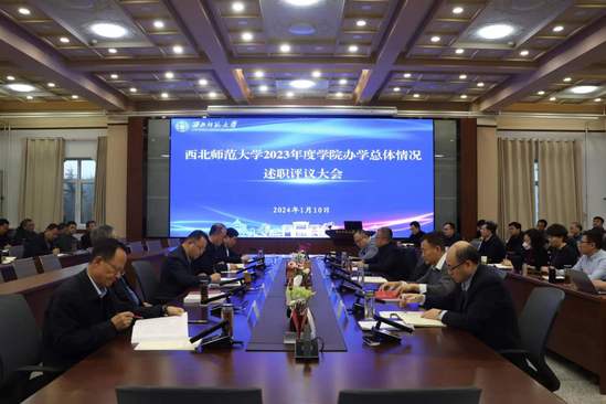 1月10日上午,西北师大2023年学院办学总体情况述职评议会召开。党委书记贾宁作分析点评,校长、党委副书记王占仁作总结讲话,校领导刘玉泉、田澍、马庆、李建民、李文生、张明军、王文昇、赵鑫对所联系学院2023年工作进行逐一点评。各学院、各单位、机关各部门负责人参加。
