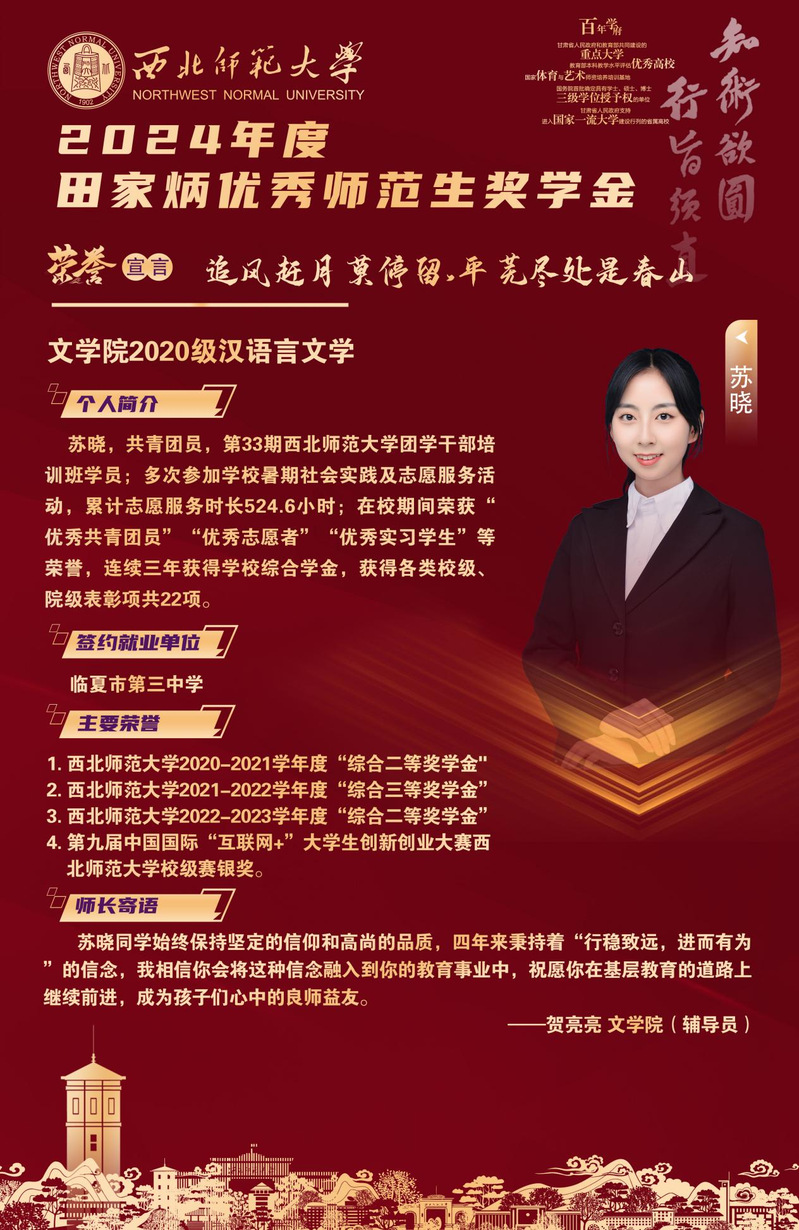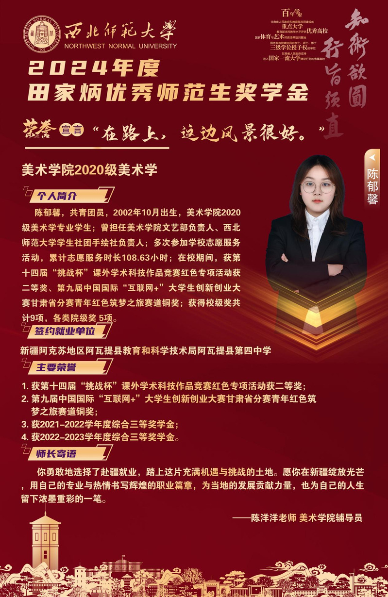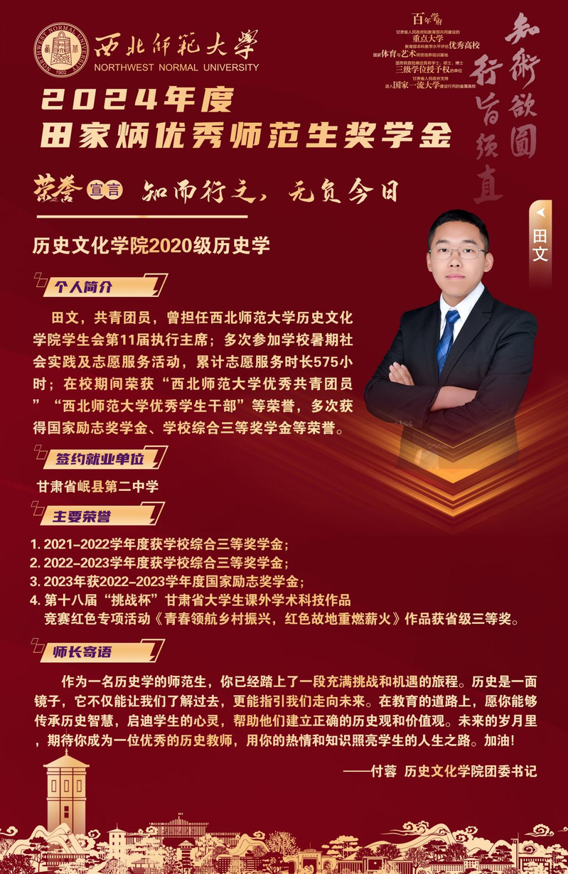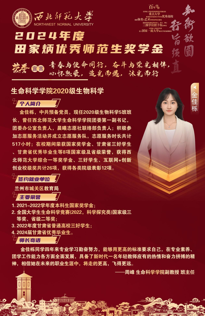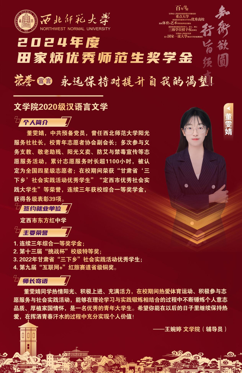 为树立“躬耕教坛 强国有我”的西北师大毕业生榜样,“田家炳优秀师范生奖学金”将荣誉赋予奔赴基层教育岗位的优秀毕业生,激励他们不断砥砺青春,续写华章。自本年度“田家炳优秀师范生奖学金”评选工作启动以来,经各学院推荐和资格审核,来自16个学院的48位优秀毕业生成为推荐候选人。其中参评一等奖、二等奖并进入最终答辩评审的22位优秀学子,他们敢于挑战,在科研领域勇攀高峰;他们无私奉献,用心用情服务师生;他们青春洋溢,在志愿活动中澎湃活力;他们脚踏实地,在扎根中国大地的教育使命中上下求索……