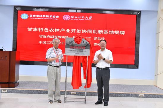 甘肃省政府副省级领导、甘肃省科学技术协会主席张世珍和中国工程院院士曹福亮共同为甘肃特色农林产业开发协同创新基地揭牌。