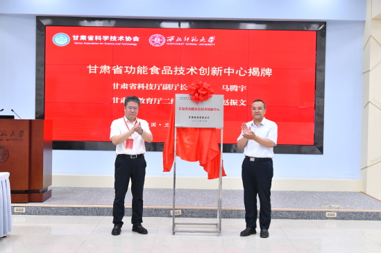 甘肃省科技厅党组成员、副厅长马腾宇和甘肃省教育厅二级巡视员赵振文共同为甘肃省功能食品技术创新中心揭牌。
