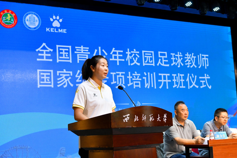 陕西省岐山县蔡家坡初级中学教师容颜娇代表全体学员发言。她表示,将严格遵守培训纪律,积极参与各项培训,将培训中获得的新知识、新技能、新理念带回学校,坚定不移地做校园足球推广普及的宣传员和践行者,为校园足球事业发展贡献力量。