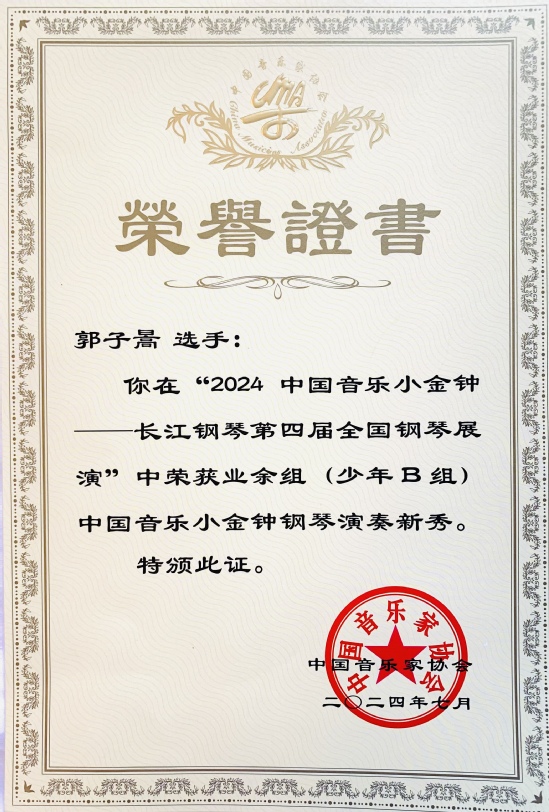 7月10日—17日,由中国音乐家协会、宜昌市人民政府主办的“2024中国音乐小金钟——长江钢琴第四届全国钢琴展演”在湖北宜昌举行,来自全国的青少年学生及青年教师共400余人参加本次展演。经过精彩激烈的角逐,日韩人妻无码一区二区三区久久99_日韩精品一区二区三区中文在线_无码日韩精品一区二区免费_久久久91精品国产一区二区三区_亚洲精品久久久一区黄无码_国产91精品一区二区麻豆网站_成人国内精品久久久久影院第二附属中学初二年级学生郭子暠荣获业余组(少年B组)中国音乐小金钟钢琴演奏新秀(二等奖)。这个奖项的获得打破了甘肃省的记录,实现了甘肃省选手在全国钢琴重大比赛中零的突破!