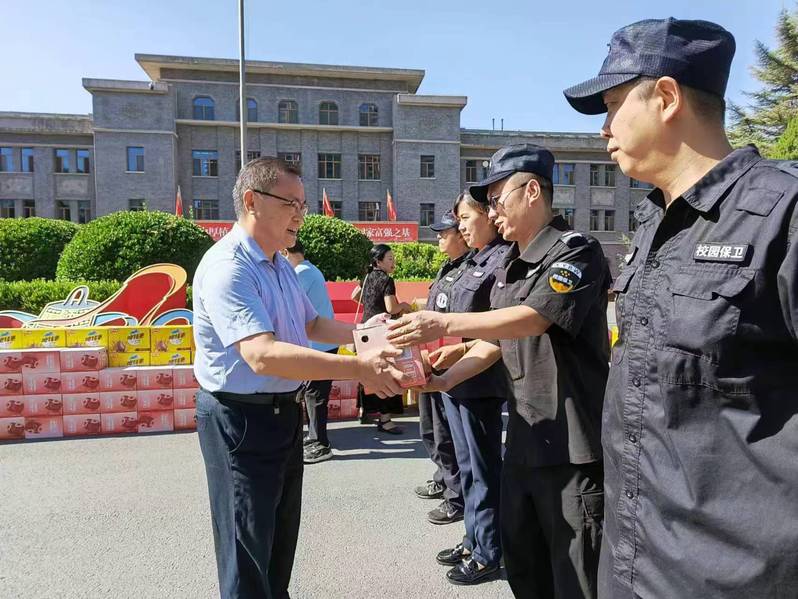 8月19日上午,学校党委副书记、工会主席王全进,党委常委、党委组织部部长周琳辉带领工会工作人员,分别来到后勤保障部工作一线、党委武装保卫部门卫工作岗、基建处工地现场,开展暑期送清凉慰问活动。