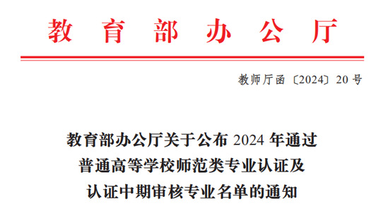 近日,教育部办公厅发布《2024年通过普通高等学校师范类专业认证及认证中期审核专业名单的通知》,西北师大学前教育、汉语言文学、数学与应用数学通过师范类专业第二级认证,认证结论有效期六年(202410月至20309月)。