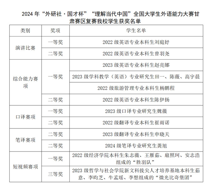 11月2日,由甘肃省教育厅主办,兰州财经大学、甘肃省大学外语教学研究会、外语教学与研究出版社承办的2024“‘外研社·国才杯’理解当代中国”全国大学生外语能力大赛甘肃赛区复赛落下帷幕。本次大赛涵盖英语演讲、综合能力、口译、笔译及短视频等5大赛项,经过激烈角逐,西北师大14名(组)同学获奖,学校获大赛优秀组织奖。