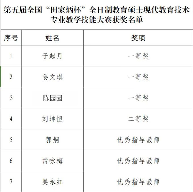 11月8日至11日,第五届全国“田家炳杯”全日制教育硕士专业学位研究生现代教育技术专业教学技能大赛在华南师范大学落下帷幕。西北师大教育技术学院荣获3项一等奖、1项二等奖3个优秀指导教师奖,获奖总数位列全国高校前列