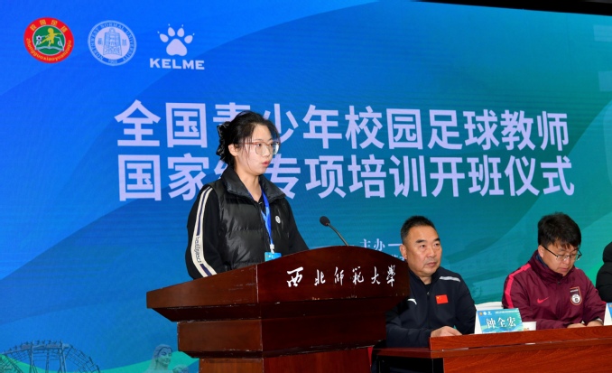 新疆兵团第一师阿拉尔职业技术学校王静远代表培训学员发言。她表示,校园足球对于青少年成长至关重要,作为体育教师,责任重大,全体参训学员严格听从学校安排,遵守培训纪律,认真听课,要积极参与各项培训和研讨,将所学的新知识、新技能、新方法融入校园足球日常教学,为推广和普及足球运动贡献自己的力量。