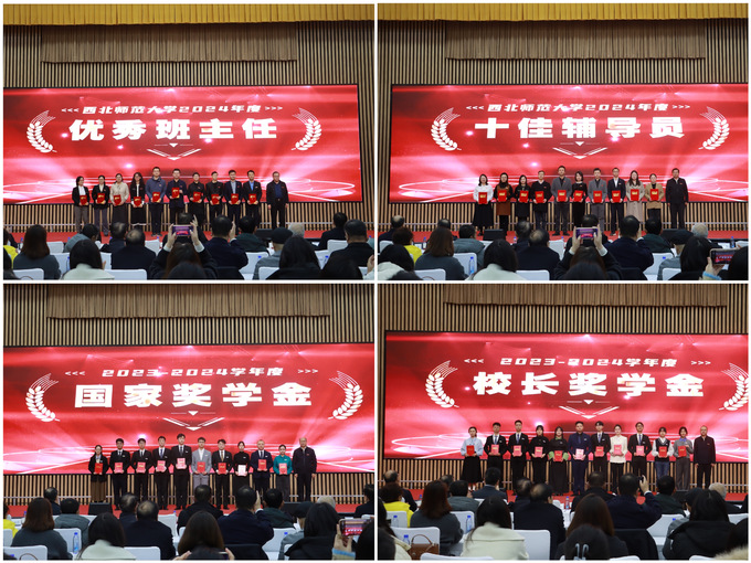 会上,贾宁为新成立机构、新增学位点授牌,并为“人才科研项目奖”获奖代表颁奖;王占仁为“团体荣誉奖”获得团体代表颁奖;王全进宣读授牌机构和通报表扬、表彰奖励名单,并为2024年度“优秀班主任”获奖教师代表颁奖;焦爱胜为2024年度“十佳辅导员”颁奖;王文昇为2023-2024学年度“国家奖学金”本硕博获奖学生代表颁奖;赵鑫为2023-2024学年度“校长奖学金”获奖学生颁奖;周琳辉为2023-2024学年度“各类单项奖学金”获奖学生代表颁奖;马世年为2023-2024学年度“社会奖助学金”获奖学生代表颁奖;阎岩为2024年度“师大好同学”获奖学生代表颁奖。