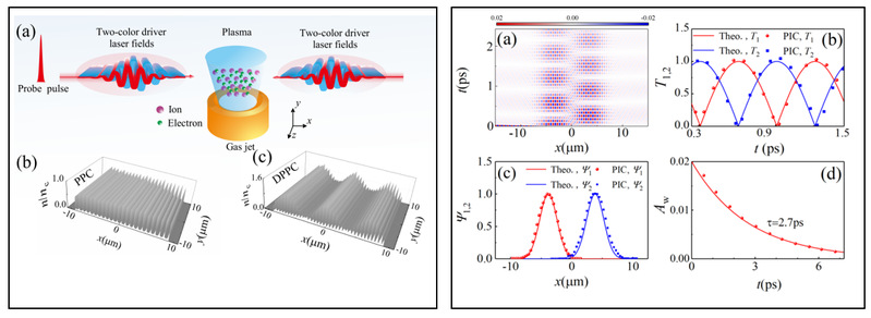 拉比振荡作为一种经典的量子现象在二能级系统、超导体、玻色-爱因斯坦凝聚体和光子晶体在内的多种系统中相继被观测或发现。目前,传统光子晶体系统中的拉比振荡现象通常无法灵活地调节晶格矢量,因而也难以调控光子带隙结构。此外,由于高功率激光会导致晶体材料的光学损伤,这类固体晶体结构只能在低激光强度下运行。与之相比,等离子体在强激光调制方面展现出一些独特优势,如高可调谐性、高损伤阈值和可重构性。特别是等离子体光子晶体的引入,克服了固体光子晶体损伤阈值的限制,为研究激光等离子体相互作用中的丰富光子现象提供了可能。
