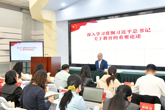 9月18日,校长王占仁以《深入学习贯彻习近平总书记关于教育的重要论述》为题我校2025年新入职教师作首场专题辅导报告。全体新入职参训教师和人事处相关负责人现场聆听报告。