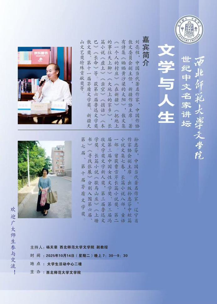 文学与人生时间::2025年10月14日(星期二)地点:大学生活动中心二楼 -