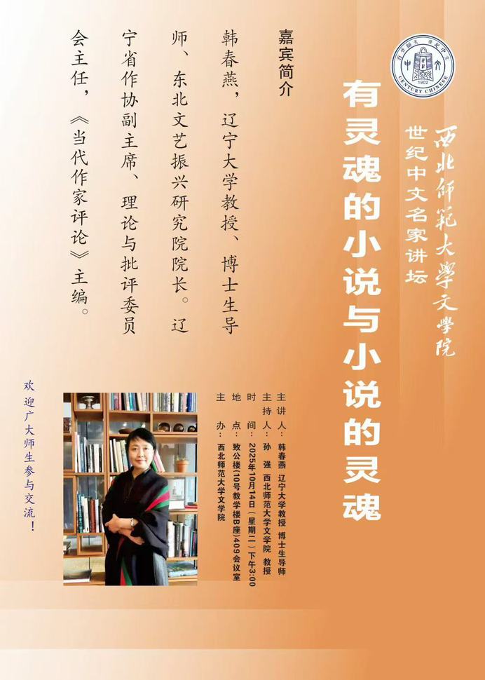 有灵魂的小说与小说的灵魂时间:2025年10月14日下午3:00地点:致公楼(10号教学楼B座)409会议室 -